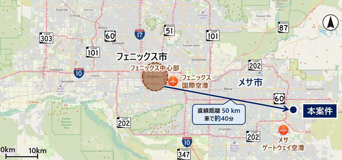 建設地のメサ市は、アリゾナ州の中部に位置する人口約51万人の都市。近年人口増加や企業進出が著しいフェニックス都市圏(人口約519万人)に位置している。開発する物流施設は同市から東へ車で50㎞、約40分の距離だ。
