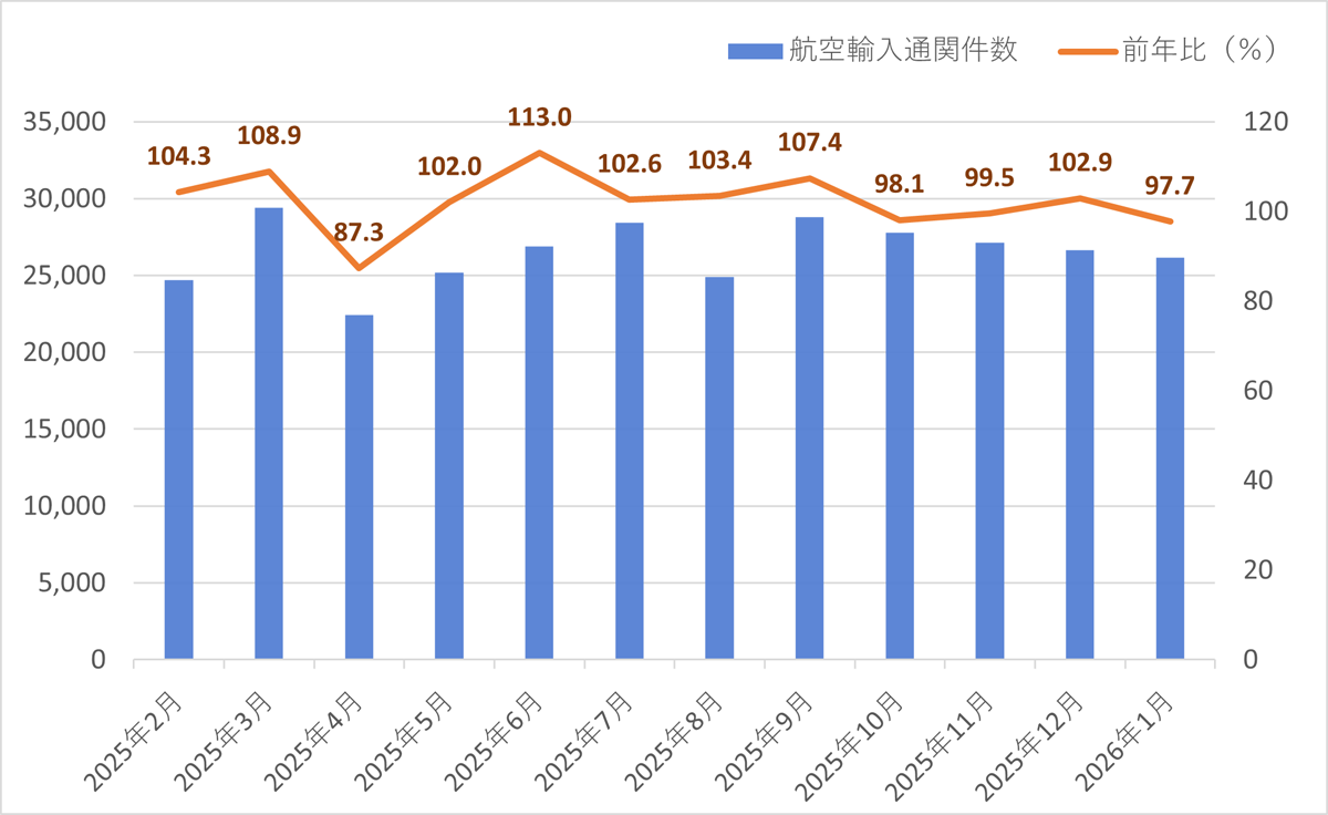 近鉄エクスプレスが2月6日に公表した1月の航空輸出混載重量は1万1347トン(前年同月比26.1%増)、航空輸入通関件数は2万6147件(2.3%減)となった。
