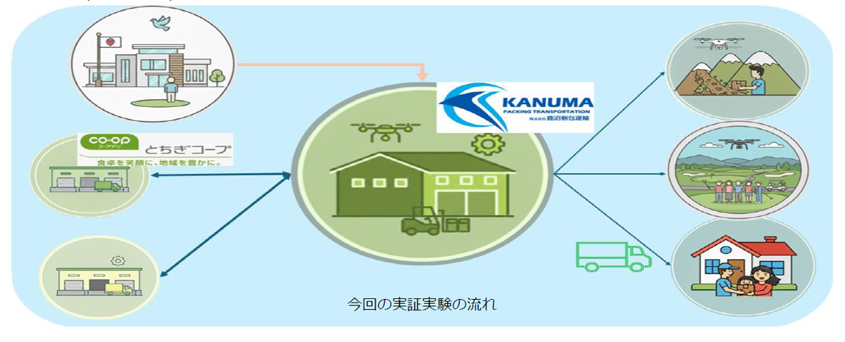 実験では、鹿沼市特有の山間地形でのドローン配送の社会実装に向けて、鹿沼市、地元物流企業、物流プラットフォーマーが連携し、鹿沼市内の3つの異なるルートで、「物流効率化」「技術的安全性」「サービス受容性」の3つの観点から検証。
