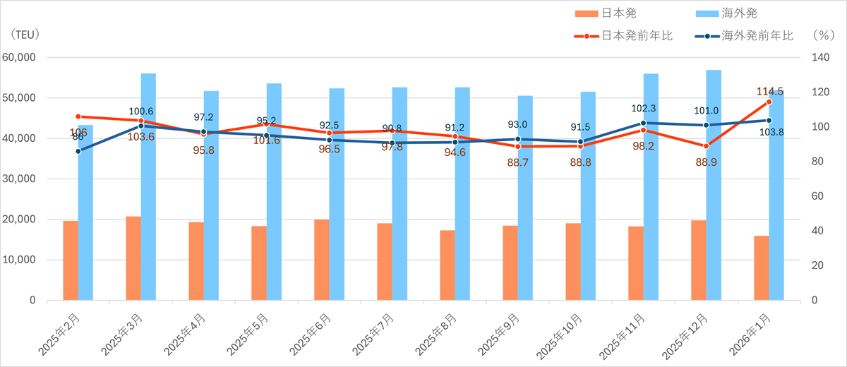 NXホールディングス(HD)が2月12日に公表した国際海上輸送取扱実績によると、1月の輸出貨物数量は日本発合計が1万5959TEU(前年同月比14.5%増)、海外発合計が5万1929TEU(3.8%増)、グローバル合計が6万7888TEU(6.2%増)となった。