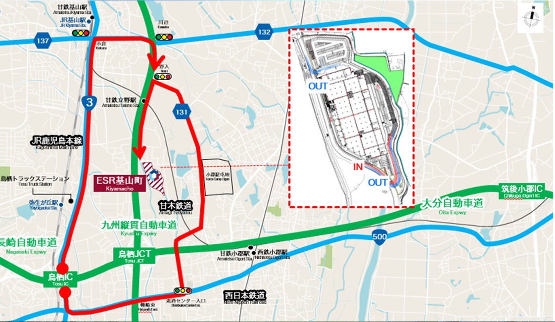 ESR基山町DCは、九州自動車道/長崎自動車道/大分自動車道が交差する物流結節点「鳥栖JCT」に至近、「鳥栖IC」約5.8kmと、九州全域への広域配送に優位性が見込まれる立地環境にある。