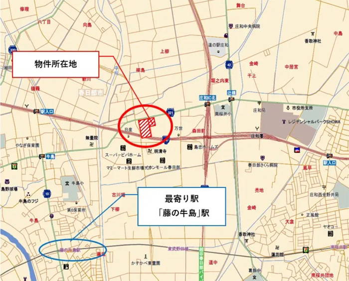 立地としては、越谷春日部バイパス「庄和IC」から約0.7kmに位置し、東部野田線「藤の牛島」駅から徒歩26分となる。