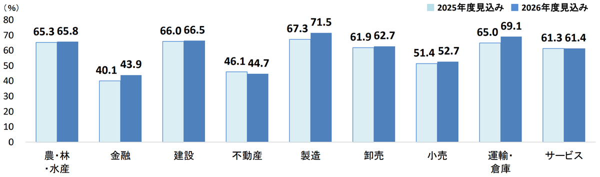 「運輸・倉庫」の2026年度の賃金改善見込みは69.1%となり、2025年度の65.0%からさらにアップとなった。1位の「製造」は71.5%、3位は「建設」の66.5%、4位は「農・林・水産」の65.8%となった。最も低かったのが、「金融」の43.9%だった。