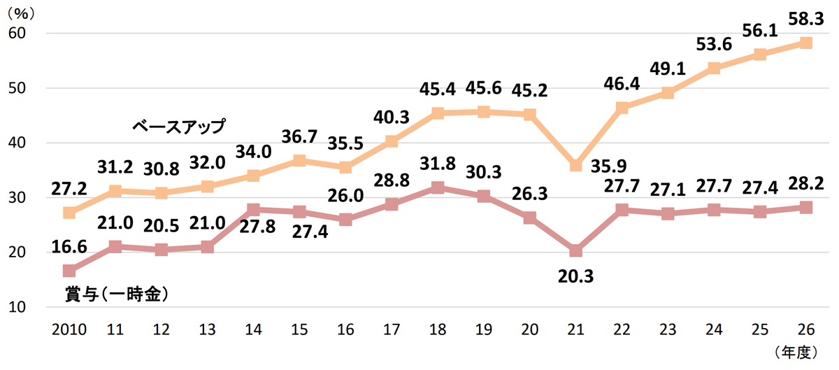 なお賃金改善の具体的な内容をみると、「ベースアップ」が 58.3%(前年比2.2ポイント増)、「賞与(一時金)」が28.2%(同0.8ポイント増)となった。「ベースアップ」は過去最高となった前年の56.1%を上回り、5年連続で調査開始以降の最高を更新した。