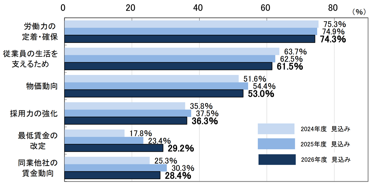 賃金改善の理由では、「労働力の定着・確保」が最多で74.3%。次いで、「従業員の生活を支えるため」が61.5%、「物価動向」53.0%と続いた。
