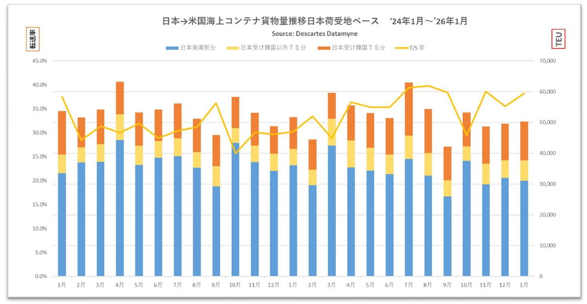 デカルト・データマインは2月25日、米国税関・B/Lデータを基にまとめた日本発米国向け(往航)海上コンテナ貨物量の20フィートコンテナ換算の1月分統計データを発表した。
