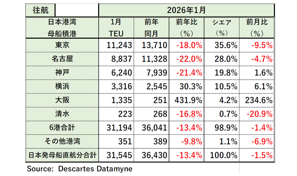 日本発母船積みベースでは3万1545TEUで前年比13.4%減と、2けた減になった。