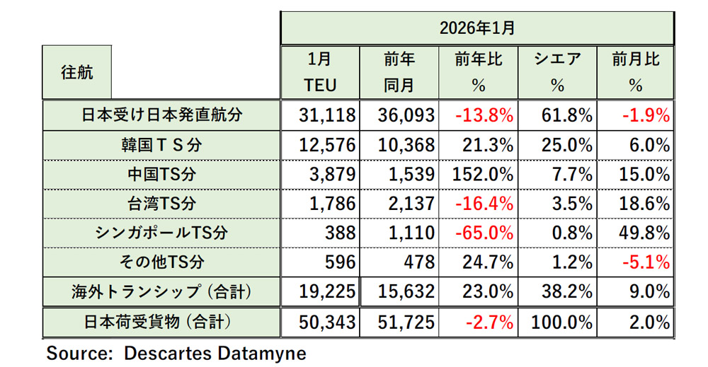 第3国へのトランシップ貨物は1万9225TEUで、前年比23.0%増(韓国21.3%増、中国152.0%増、台湾16.4%減、シンガポール65.0%減)だった。