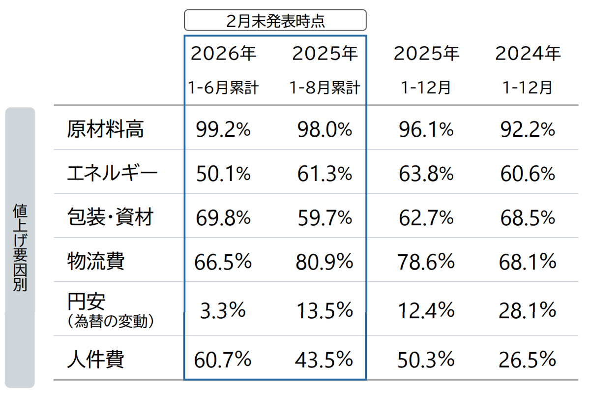 他方で、トラックドライバーの時間外労働規制などが要因となった輸送コストの上昇分を価格に反映する「物流費」由来の値上げは66.5%となり、前年通年の78.6%から大幅に低下した。