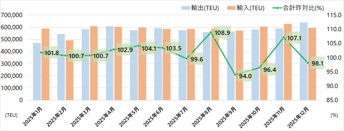 内訳は、輸出が63万9743TEU(2.1%減)、輸入が59万5874TEU(1.6%減)だった。
