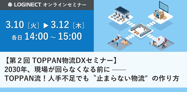 TOPPANエッジ/TOPPANデジタル/アイオイ・システムは3社共催で3月10日~3月12日の3日間、第2回物流DXセミナー「2030年、現場が回らなくなる前に─TOPPAN流!人手不足でも”止まらない物流”の作り方」を開催する。