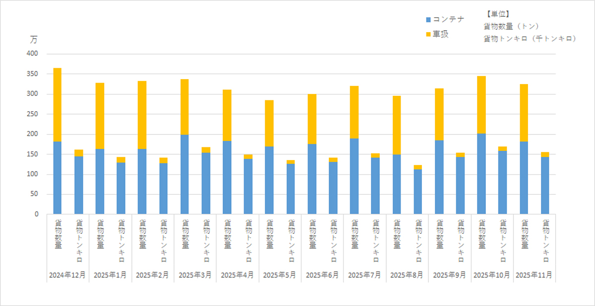 国土交通省が3月3日に公表した2025年11月の鉄道輸送統計月報によると、貨物数量総合計は324万7197トン(前年同月比6.6%減)、貨物トンキロ総合計では15億5723万1000トンキロ(5.4%減)となった。