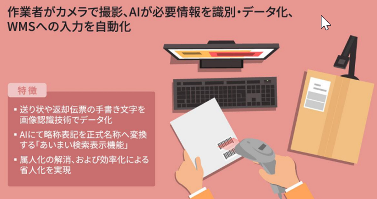 配送会社の送り状伝票をカメラ撮影して医療機関名・ディーラー名を画像認識技術でデータ化し、略称表記や手書きで記載されている場合にはAIで正式名称に変換する「あいまい検索表示機能」で正確にデータ化する。