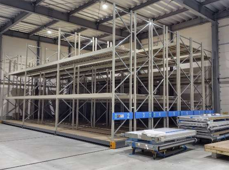 新倉庫は延床面積493.35m2で、移動式ラックを導入し保管効率を最大化。保管可能数は約2.6倍に拡大した。