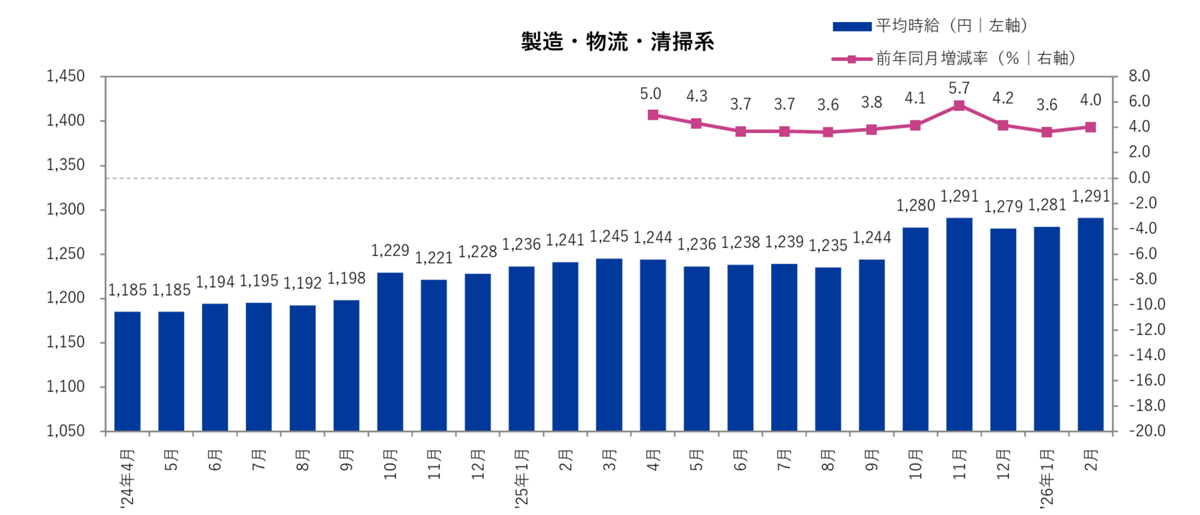 20260313recruit - 物流系のアルバイト・パート募集時平均時給/2月は4.0%増