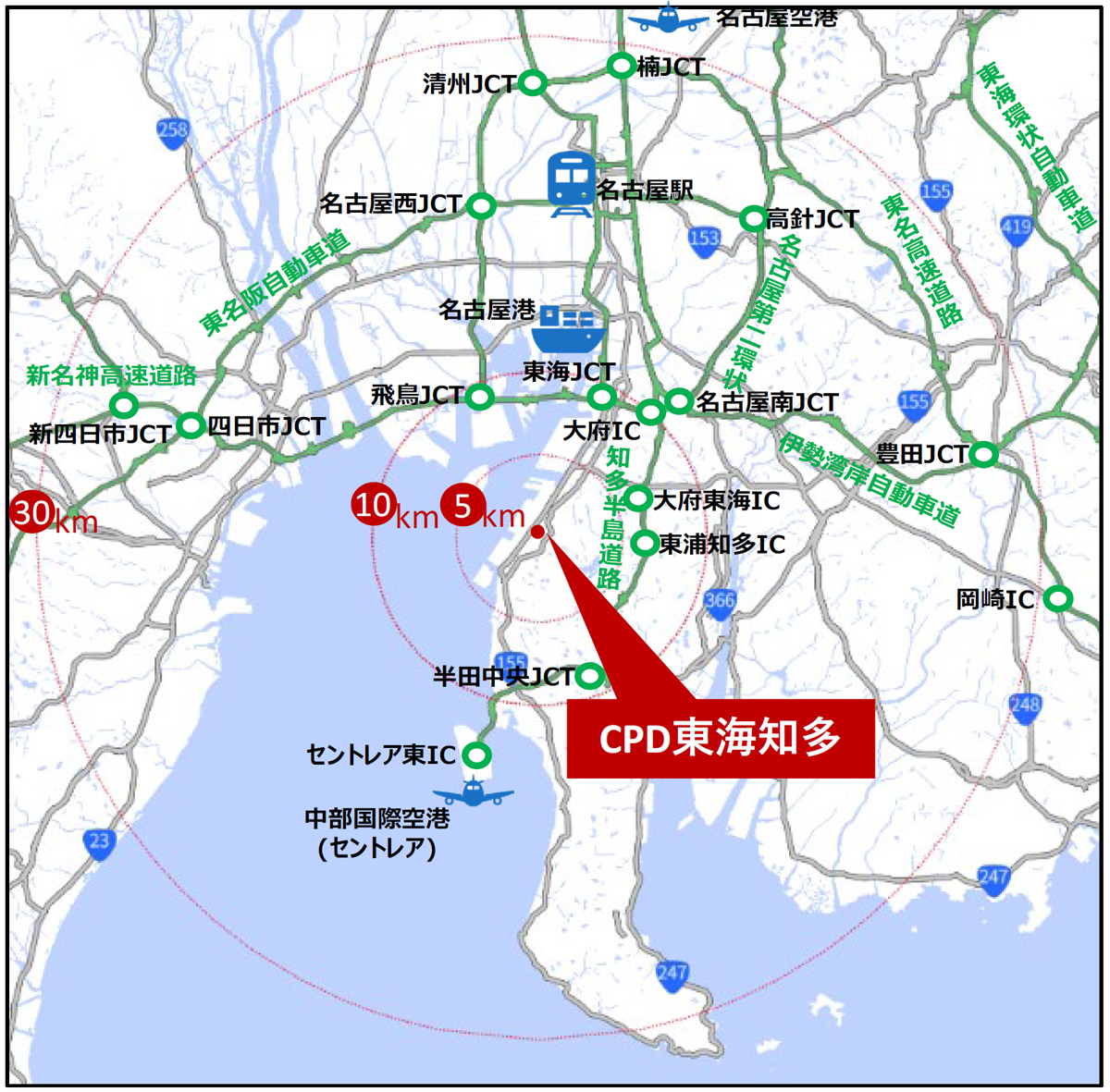 西知多産業道路から東海JCTで名古屋高速道路に接続されていることから、名古屋市中心部へのアクセスも容易となっており、広域配送拠点としての活用も可能だ。