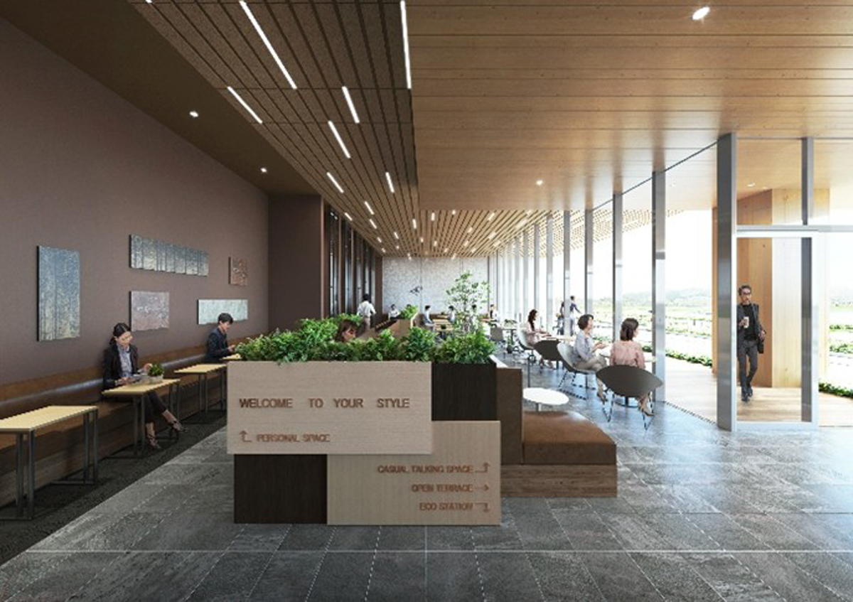 「MFLP・LOGIFRONT京都八幡I 」のエントランス、ラウンジは周囲の風景に準じた配色を導入して利用者に安らぎを与えるとともに、サブエントランスには八幡市の名産品である竹をモチーフにしたルーバーを採用し、地域のアピールにもつなげる。