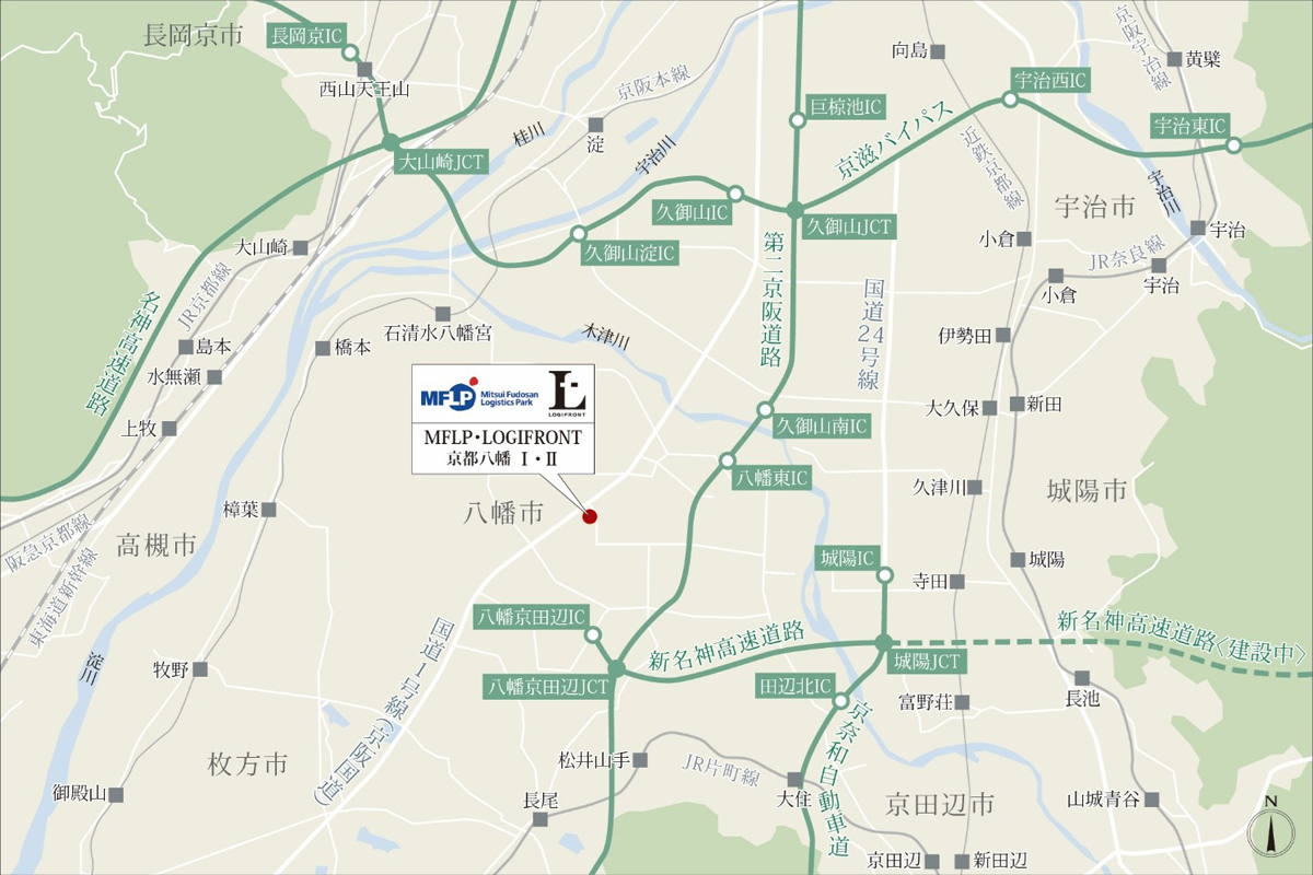 第二京阪道路「京田辺松井」ICから約3.7km、新名神高速道路「八幡京田辺」ICから約2.8kmの立地に加え、将来的な新名神高速道路全線開通による名古屋や神戸へのアクセス性向上も予定しており、関西での東西ハブ拠点として重要な役割が期待される。