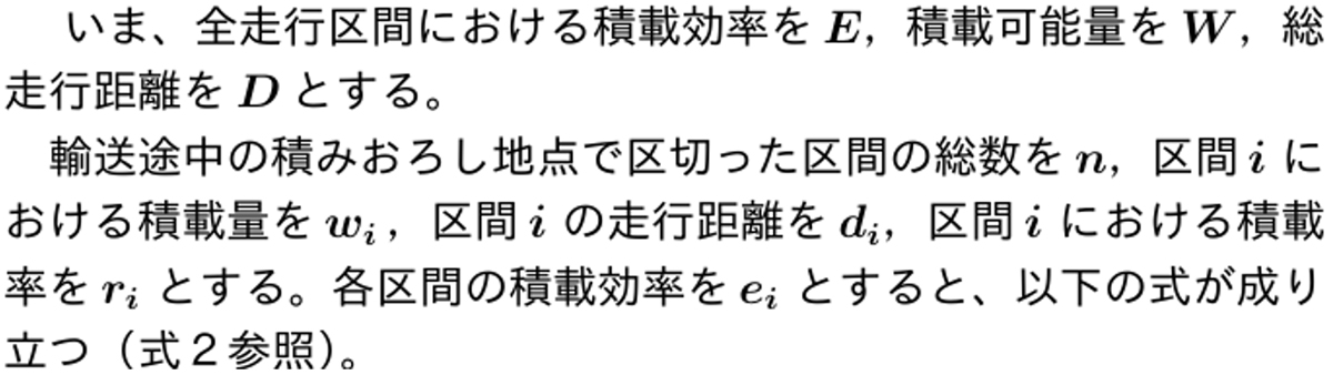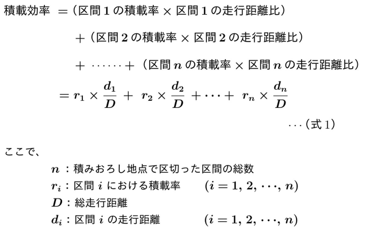 よって、積載効率は次式のように、走行距離比を重み付けとした積載率の「加重平均」と考えることができる(式1参照)。