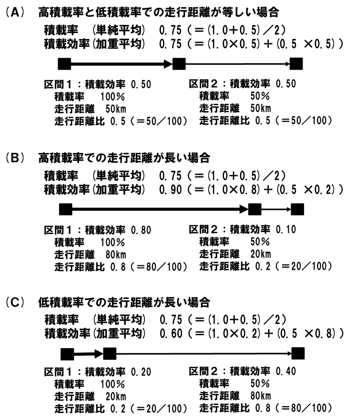 積載率の平均(単純平均)は、(A)、(B)、(C)のすべてのケースで等しく、75%となる。これは、いずれの場合も積載率100%の区間と積載率50%の区間の2つの区間で構成されているため、それぞれの区間の距離にかかわらず平均(単純平均)は、75%(=(1.00+0.50)/2)となるからである。