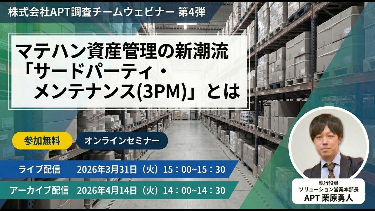 APTは3月31日および4月14日に、「マテハン資産管理の新潮流『サードパーティ・メンテナンス(3PM)』とは」をオンライン開催する。4月14日はアーカイブ配信。