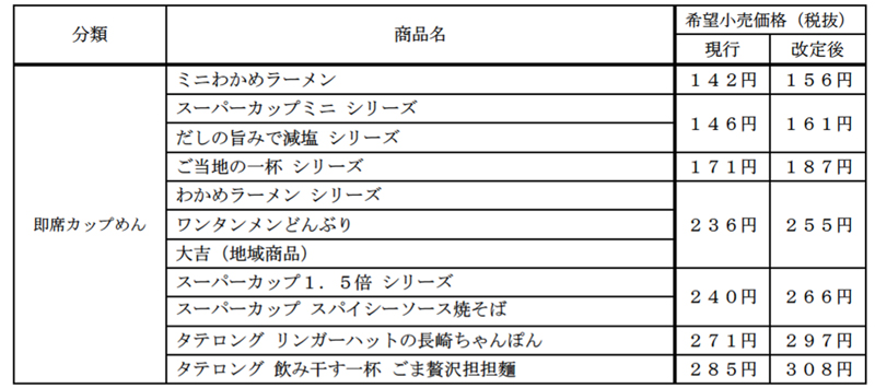 スーパーカップミニシリーズが146円から161円に、わかめラーメンシリーズが236円から255円に上がるなど、希望小売価格(税抜)の約8~11%の価格改定となる。