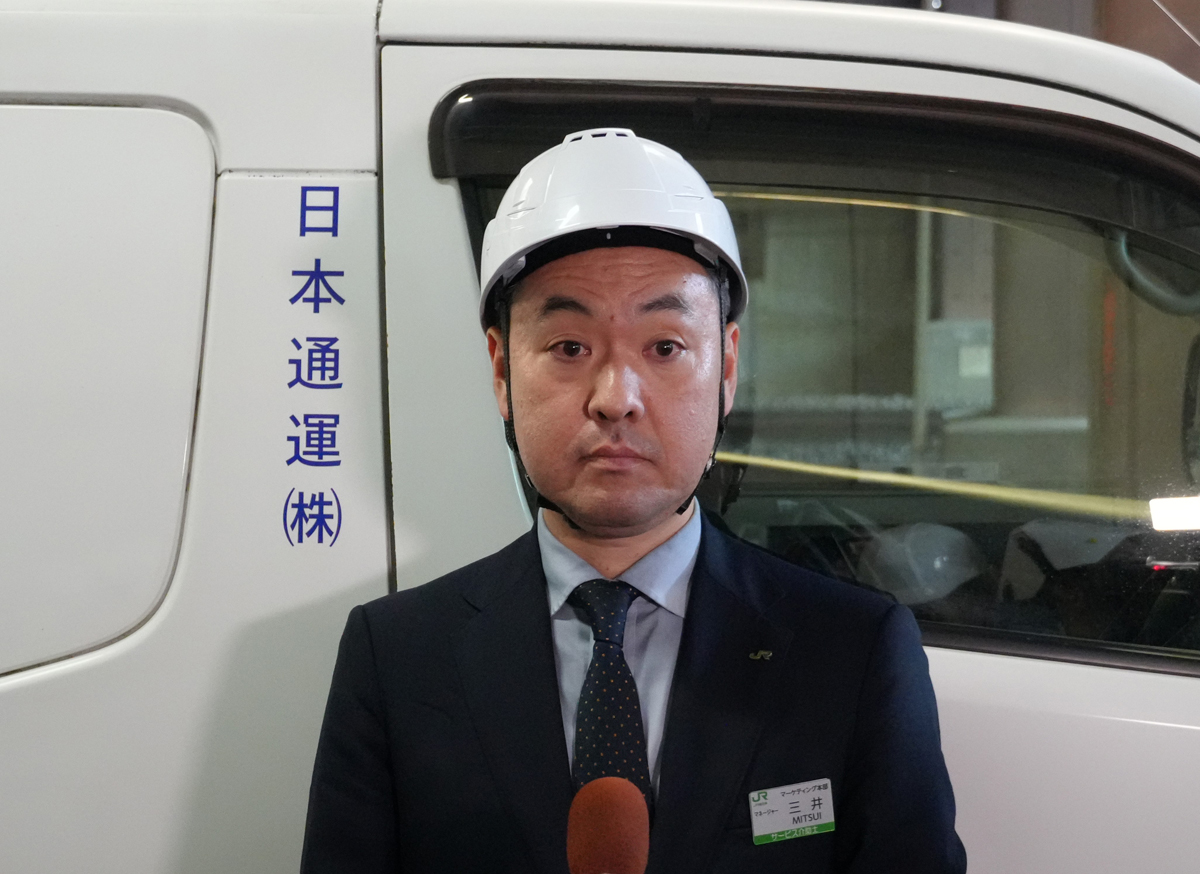 初便到着後に記者団の質問に応じたJR東日本マーケティング本部まちづくり部門開発戦略ユニットの三井 陽介 マネージャーは、荷物専用新幹線について顧客から東京発や仙台発着、上越新幹線方面などでの運行を望む声があることを明らかにした上で、まずは盛岡発での運行を通じて、揺れが少なく時間に正確な新幹線の強みをベースにした荷物輸送の実績を積むことが重要であるとの考えを強調した。