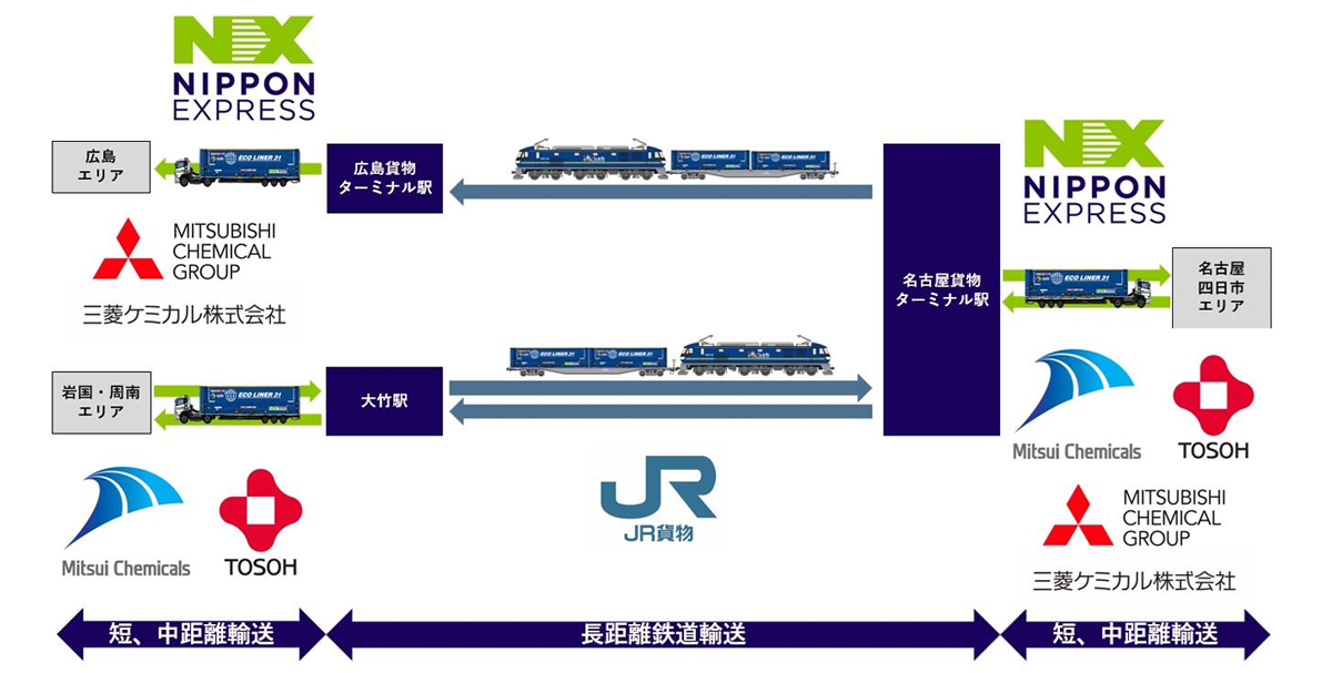 実証実験は2025年8月から2026年1月まで、東海・中国地区における鉄道輸送による共同物流実現に向け、化学品WG内の三菱ケミカル、東ソー、三井化学と、JR貨物、日本通運が実施。