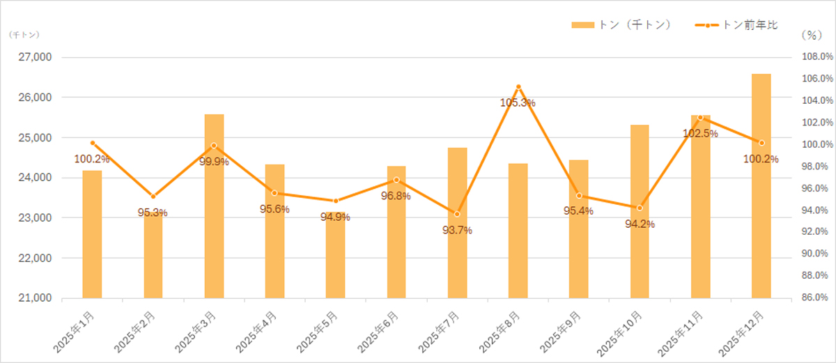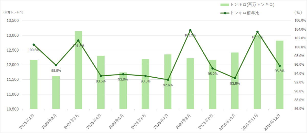 国土交通省が3月24日に公表した2025年12月分の内航船舶輸送統計月報によると、総輸送量は2658万1000トン(前年同月比0.2%増)、128億2300万トンキロ(4.2%減)となった。