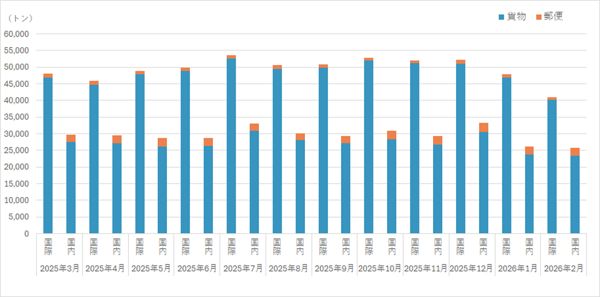 国内貨物は2万3457トン(2.3%減)、国内郵便は2208トン(10.3%増)だった。