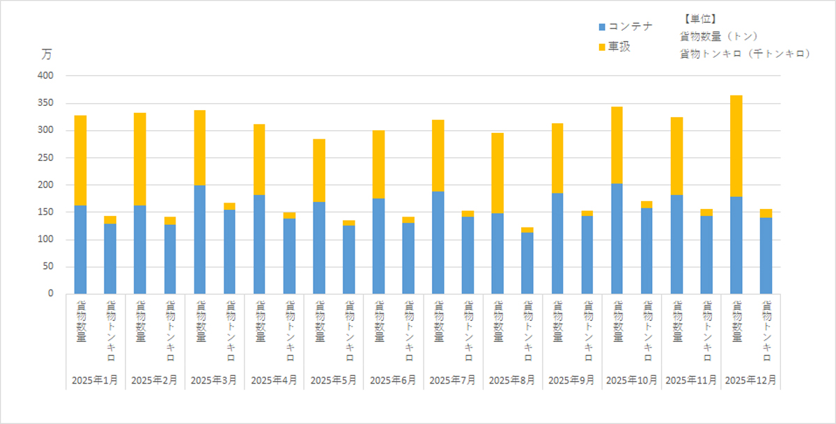 国土交通省が3月25日に公表した2025年12月の鉄道輸送統計月報によると、貨物数量総合計は365万493トン(前年同月比0.1%減)、貨物トンキロ総合計では15億6187万4000トンキロ(3.1%減)となった。