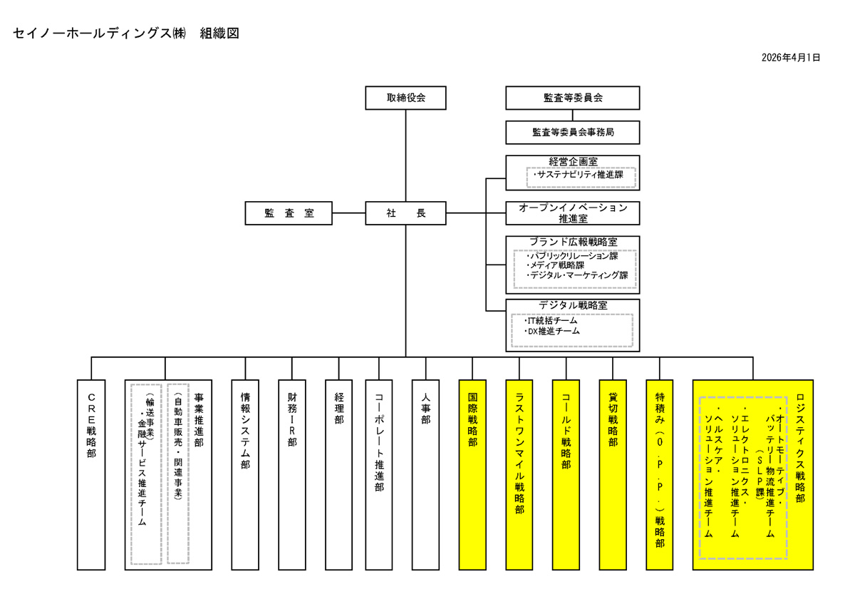 セイノーホールディングスは、顧客への「+α」の価値提供を通じて輸送事業のさらなる成長につなげるため、4月1日付で新たな戦略企画セクションの設置を柱とする組織変更を行う。