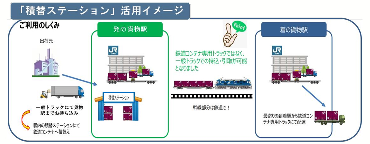 日本貨物鉄道(JR貨物)東北支社は4月1日から、鉄道コンテナが利用しやすくなるよう「積替ステーション」を、仙台貨物ターミナル駅、石巻港駅、山形オフレールステーション駅の構内に開設する。