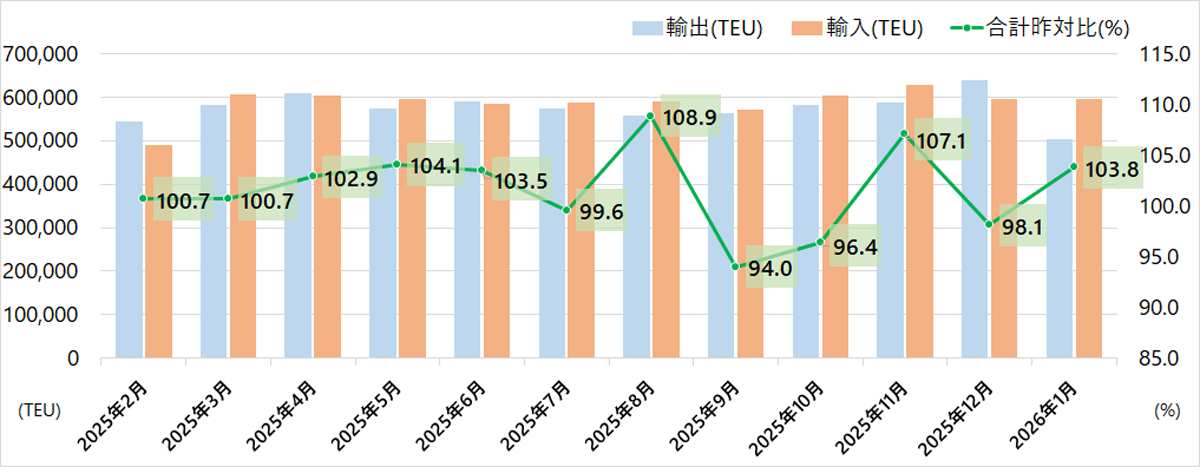 内訳は、輸出が50万3799TEU(7.1%増)、輸入が59万5072TEU(1.2%増)だった。