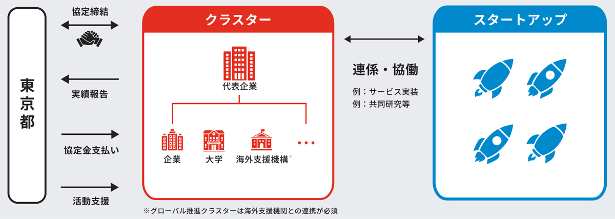 「TIB CATAPULT」では、大企業や投資家など複数の事業者による共同体「イノベーションクラスター」が、グローバルなスタートアップを育てていくことを支援する。