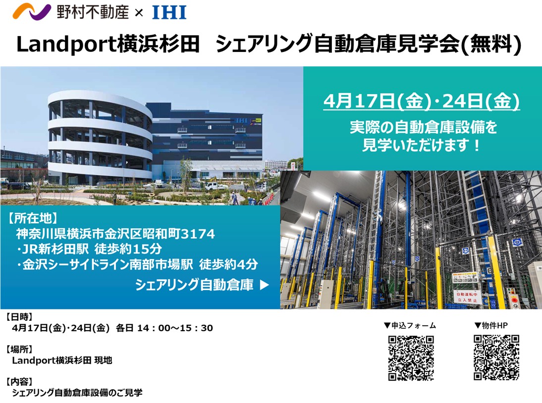 野村不動産およびIHIは4月17日・24日に、神奈川県横浜市金沢区「Landport横浜杉田」でシェアリング自動倉庫の現場を体感可能な無料見学会を開催する。