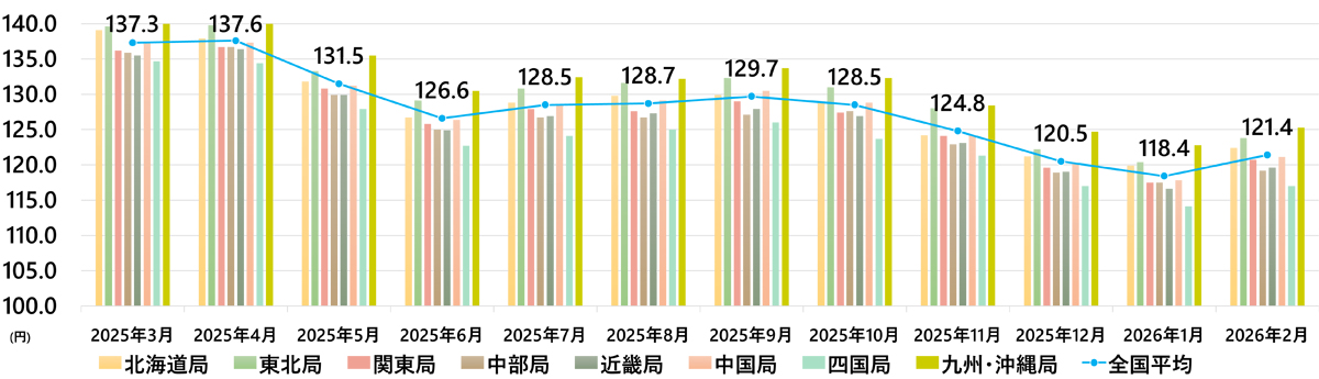 資源エネルギー庁が3月31日に公表した2月の軽油インタンク納入価格は、1リットル当たりの全国平均が121.4円(前月比3.0円増)となった。