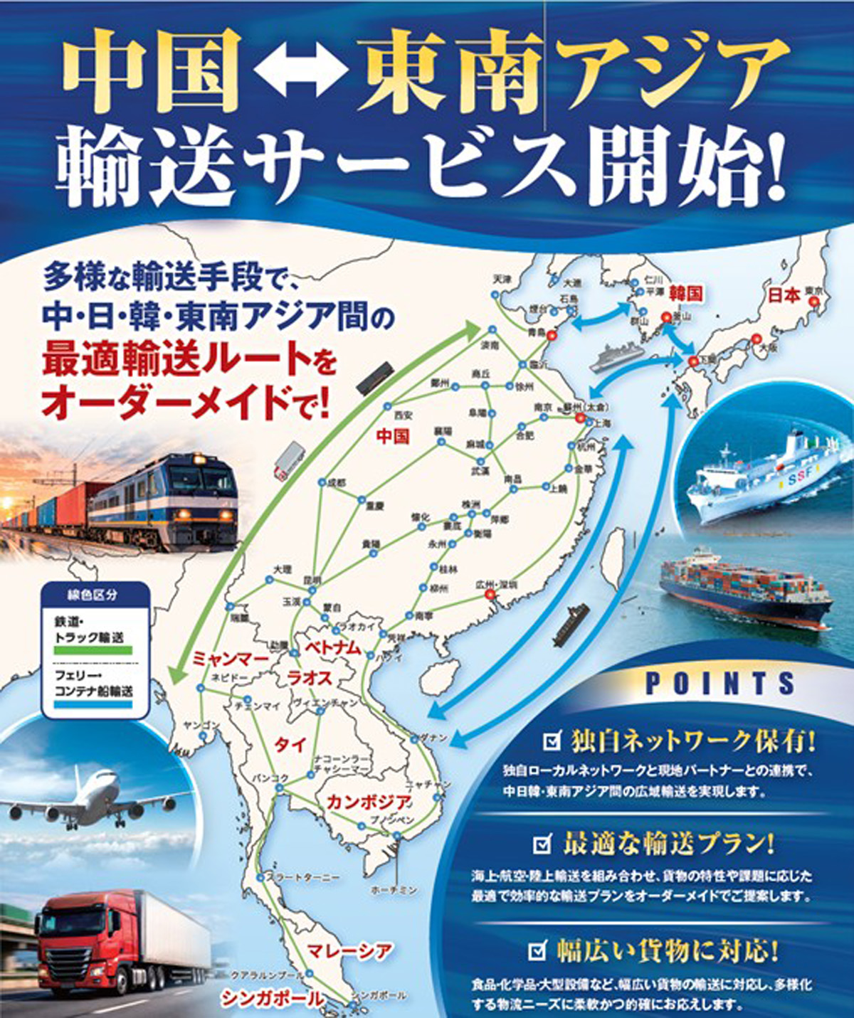 鉄道、トラック輸送、フェリー・コンテナ船輸送を組み合わせた複合一貫輸送を提供し、日本、韓国、中国の各主要都市から、ベトナム、ミャンマー、ラオス、タイ、カンボジア、マレーシア、シンガポールなどの東南アジア各国を広範囲にカバーする。