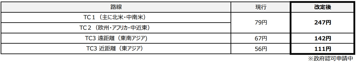 新たな決定方法に従い3月後半の燃油価格(シンガポールケロシン平均価格)208.76米ドルに基いた4月16~30日の重量1kg当たりのサーチャージ額は、TC1(主に北米・中南米)とTC2(欧州・アフリカ・中近東)向けが現行の79円から247円に、TC3遠距離(東南アジア)向けが67円から142円に、TC3近距離(東アジア)向けが56円から111円に引き上げられる。