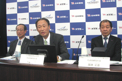 <統合の理由などを説明する矢野俊一・郵船航空サービス社長、工藤泰三・日本郵船社長、深津正彦・NYKロジスティックスジャパン社長>
